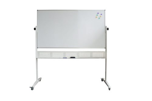 The Rapidline mobile whiteboard has a lacquered steel double sided whiteboard surface with galvanised steel backing and a low density fibreboard core. The mobile frame is double sided and pivoting with locking castors. Backed by an 8 year warranty. -