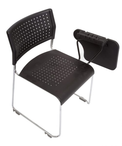 Our versatile Wimbledon chair with added plastic table on a steel arm attached to the right arm. Plastic perforated back and waterfall seat and chrome steel rod sled base. The chair stacks and links and has options for a fabric seat or back pad and can be moved with a trolley. Bifma tested and backed by a 3 year warranty -