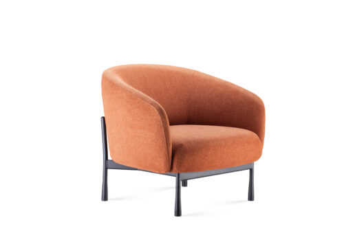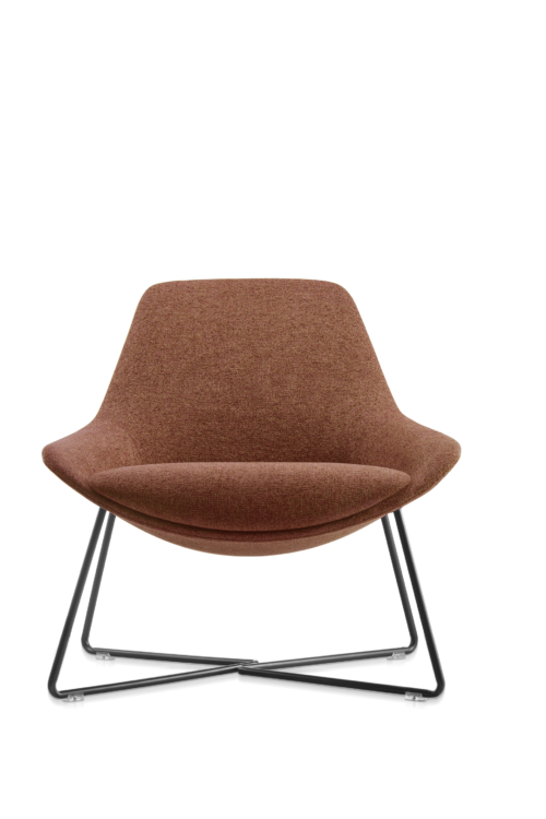 A modern breakout chair with molded foam and a sleek steel cross-leg base, upholstered in durable fabric—ideal for reception or collaboration zones. -