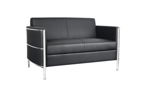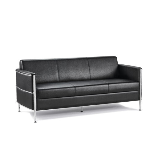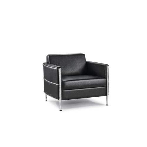 The Eclipse Lounge Range offers a contemporary seating solution with a chrome wrap-around frame and black PU leather upholstery. Designed for comfort and durability, it features adjustable feet for leveling on uneven surfaces and is tested to meet rigorous safety standards. Backed by a 3-year warranty for peace of mind. -