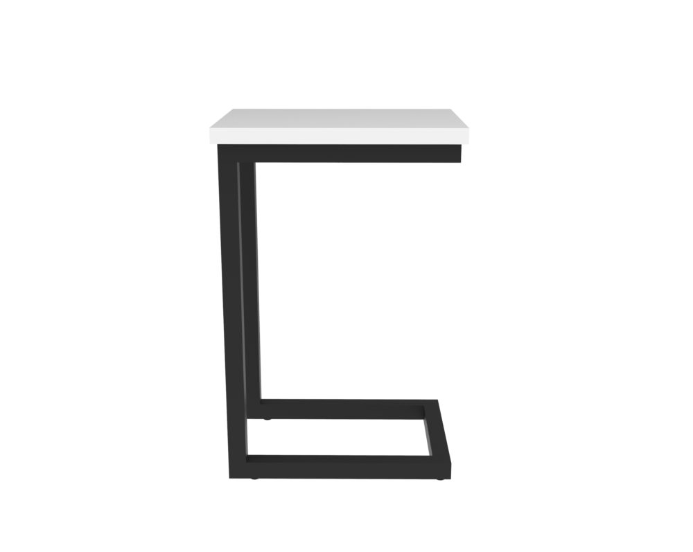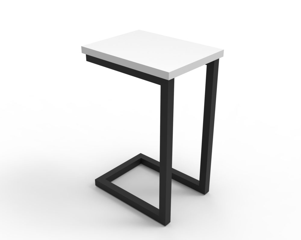 The Eternity side table features a powdercoat cantilever frame in black or white that slides conveniently under lounges or sofas.